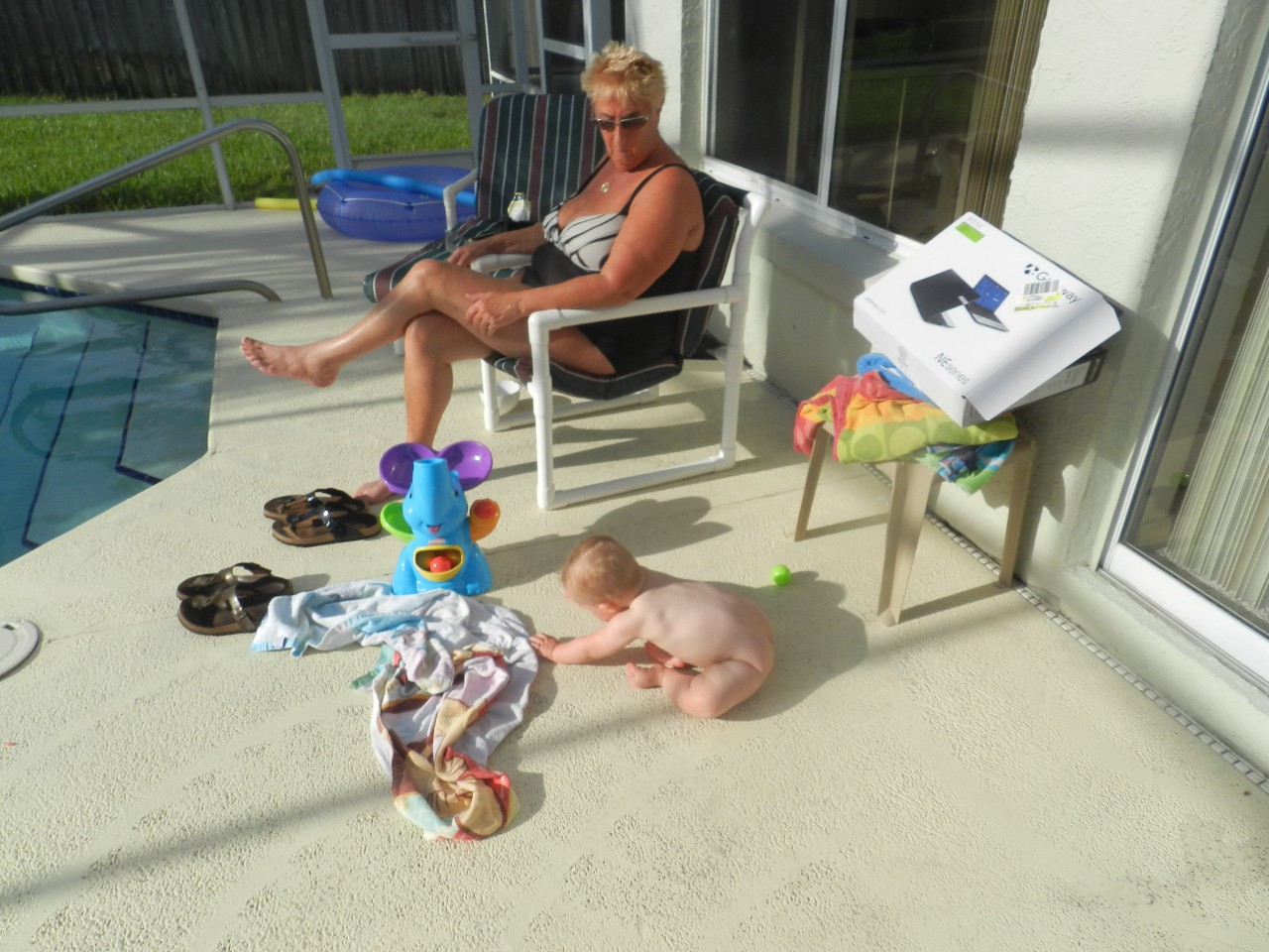 Het is weer heerlijk zonnig en al vroeg lekker warm buiten. Dus na ons ontbijtje nemen we een duik in het zwembad en hangen we een beetje rond.